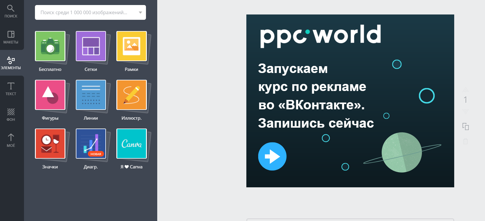 Canva — удобный и простой сервис с большой библиотекой бесплатных изображений и шаблонов оформления. Правда, отсутствуют многие полезные инструменты и функции более продвинутых графических редакторов, но новичок вполне может обойтись без них, особенно если дизайн простой и минималистичный.