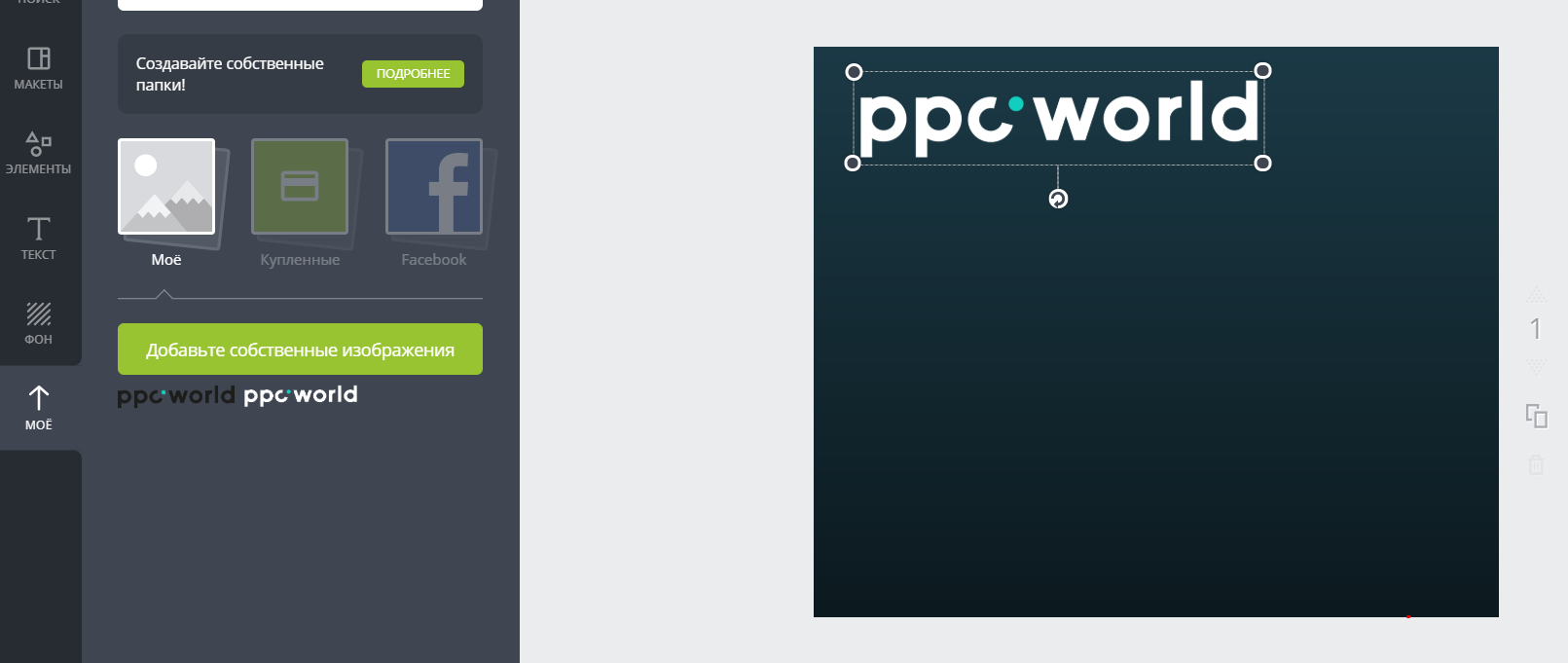 Чтобы добавить к фону элементы (логотип, дополнительные изображения) переходим в раздел «Мое». Сюда можно загрузить изображения с компьютера. Чтобы разместить их на баннере, просто перетащите загруженные картинки из галереи на рабочее поле. Удобно, что можно сразу загрузить в медиатеку все элементы, которые планируете использовать для создания баннеров, и потом по очереди перетаскивать и редактировать.