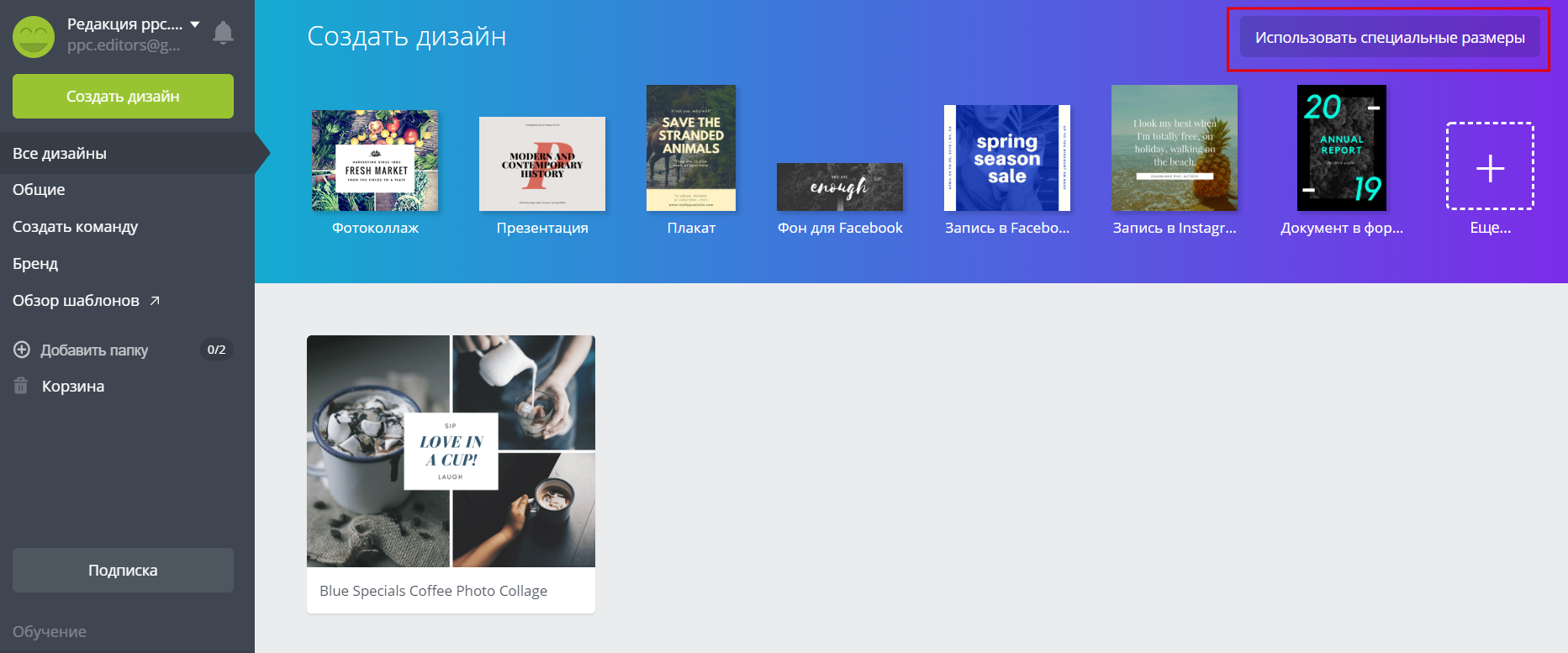 Чтобы начать работу с изображением нажимаем «Создать дизайн», затем — «Использовать специальные размеры».