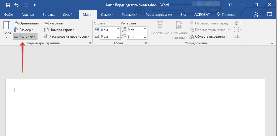 Теперь, когда текстовый документ Ворд представляет собой пустую основу для буклета, разделим ее на необходимое количество частей — колонок, каждая из которых в дальнейшем будет представлять отдельную страничку.