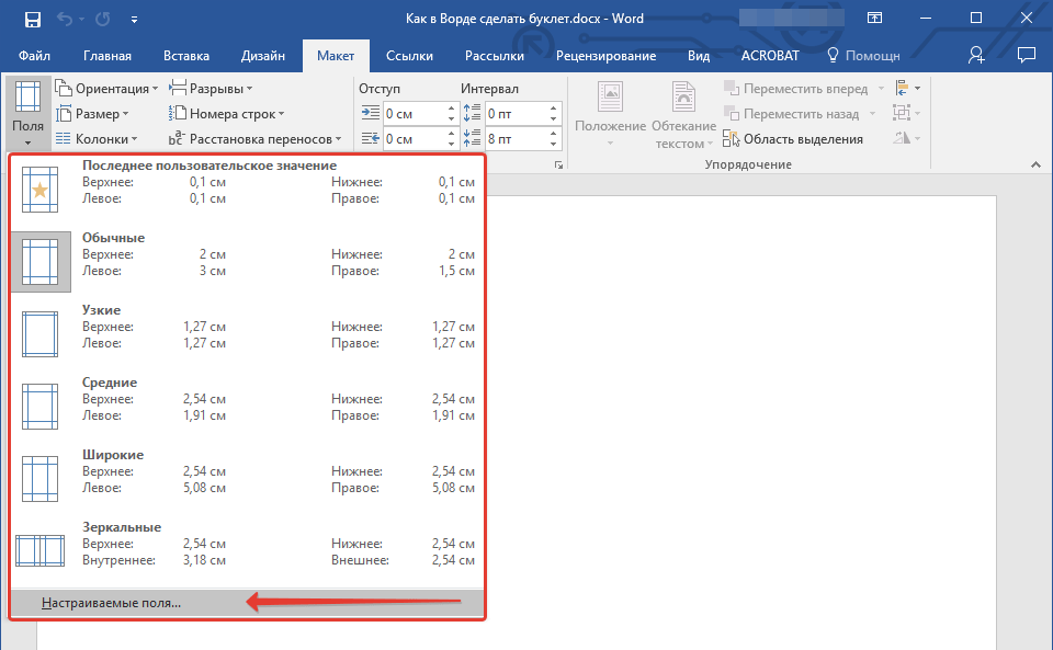 Обычно поля размером в 1.27 сантиметра отлично подходят для создания буклетов. Но, если хотите еще меньшие поля то выберите вариант « Настраиваемые поля ».