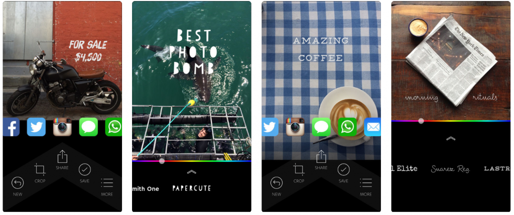 Отличная утилита, позволяющая делать красивые надписи на изображении и отправлять их в Инстаграм и Фейсбук. С помощью данного приложения можно легко выбрать необходимое фото из библиотеки мобильного устройства, написать на нем текст, поменять шрифт и цвет надписи. Недостатки: водяной знак и ограниченное количество шрифтов. Стоимость решения данной проблемы 149 руб.
