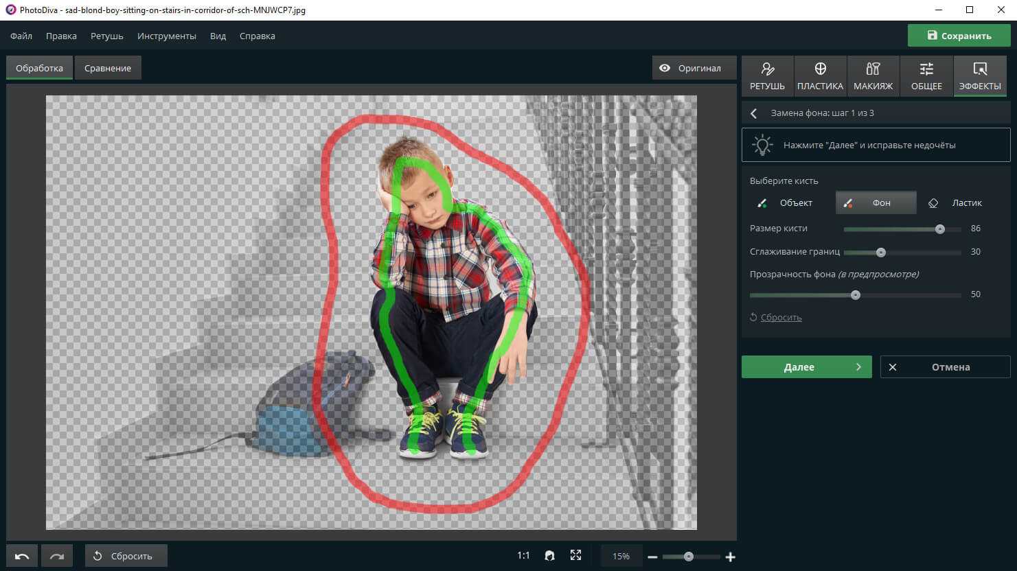 В программе «Домашняя Фотостудия» вы сможете вырезать любой объект с фото и перенести его на другой фон. Например, это будет актуально, если на заднем плане представлены какие-либо лишние объекты или фон исходника просто скучный. Откройте фотографию в редакторе, перейдите в меню «Эффекты» и выберите пункт «Замена фона». На экране появится новое окно, в котором вам нужно будет отделить объект от неудачного фона. Щелкните рядом с нужной фигурой и аккуратно обведите ее по контуру.
