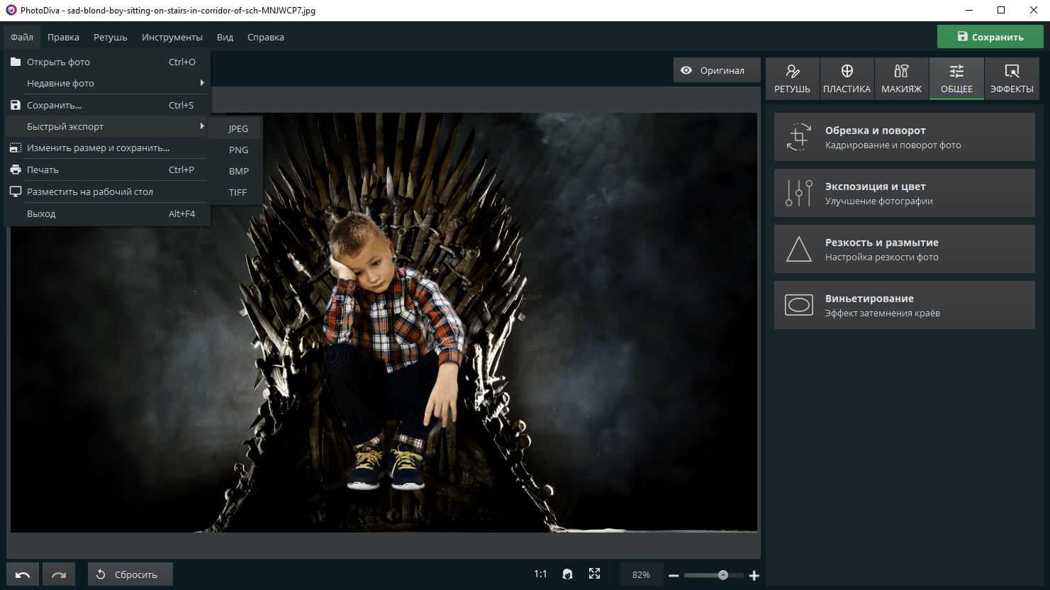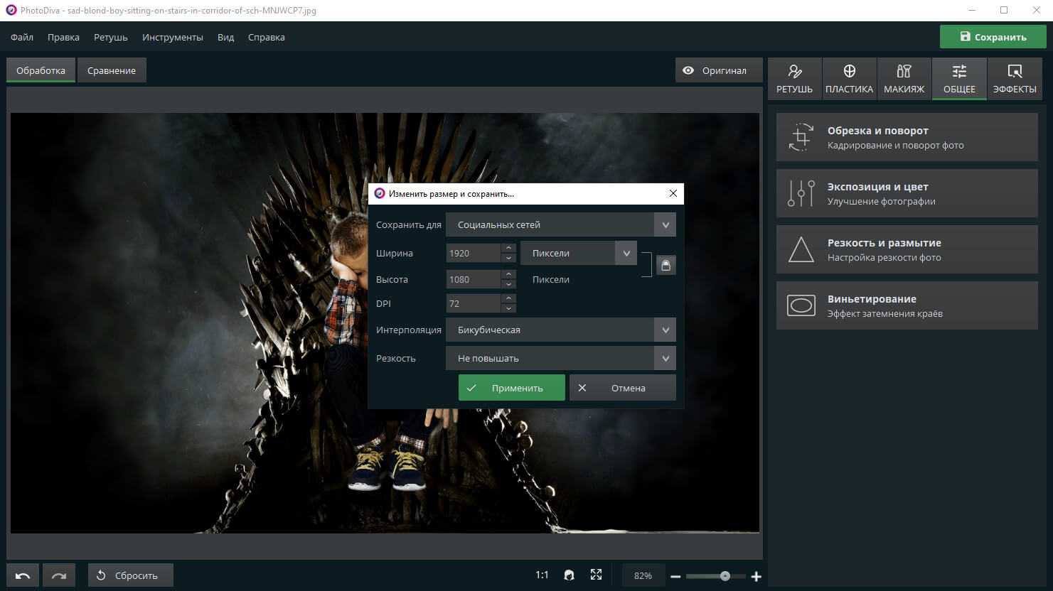 - Раздел «Общее» содержит опции для базового улучшения фотоизображения: кадрирование, настройка экспозиции и цвета, добавление резкости, размытия, виньетки.