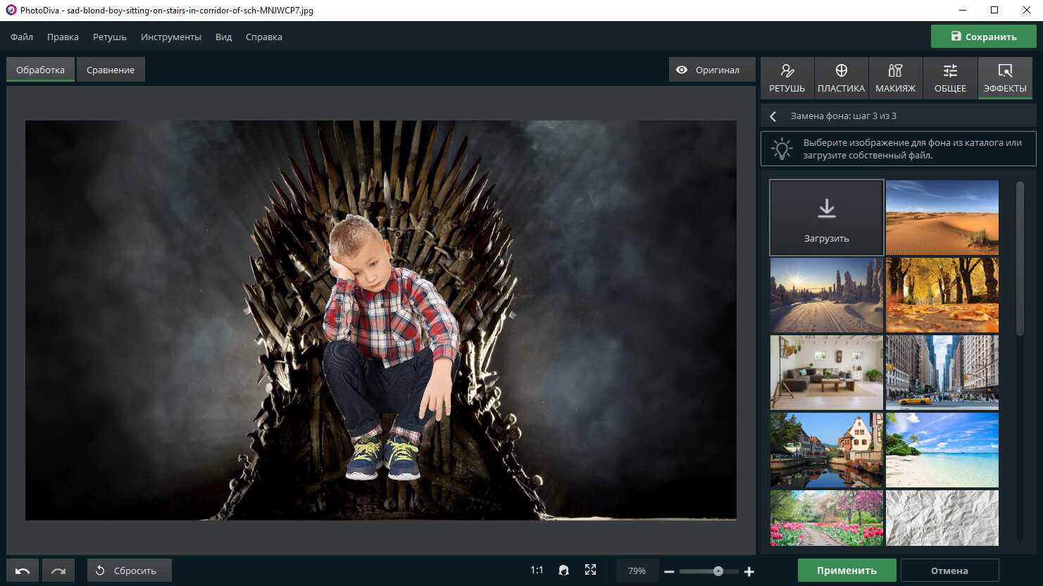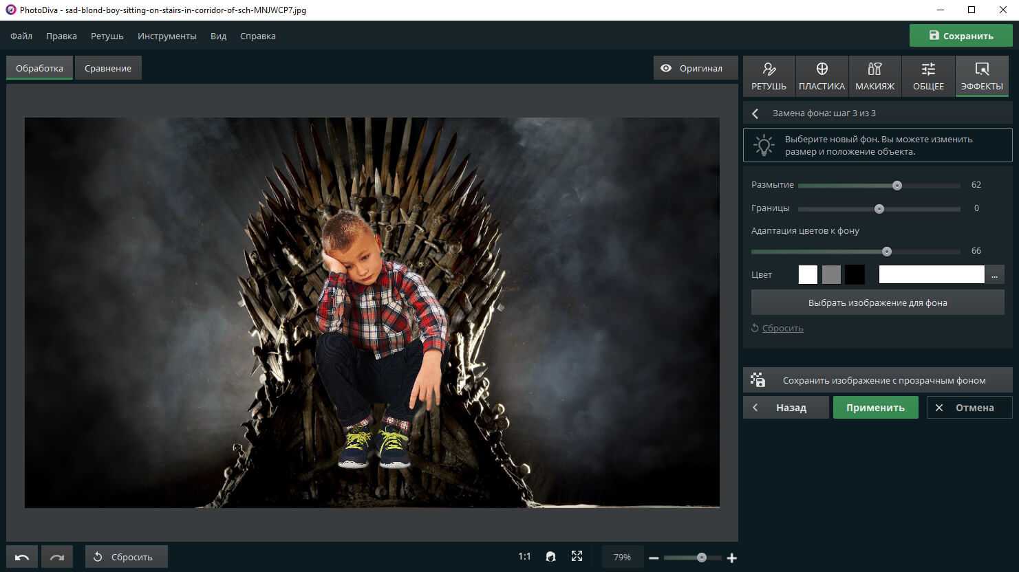 После нажатия кнопки «Применить» или «Сохранить в файл» в окне режима «Фотомонтаж» все внесённые изменения на фото будут сохранены, и откатить их уже не удастся. Поэтому не забывайте про запасные копии оригинальных картинок. В любом случае, программа выведет вас в своё основное окно, где можно будет отретушировать фото и сохранить его на память.