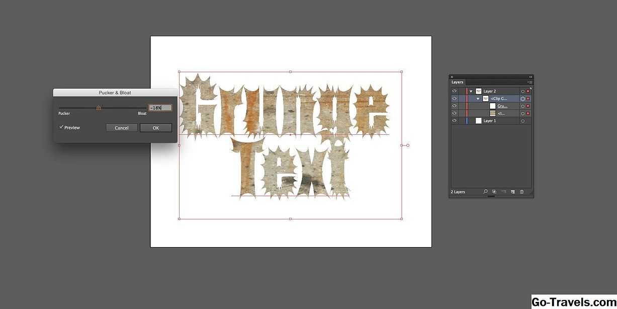 Теперь, когда текст представляет собой ряд фигур, вы можете применить обтравочную маску, а фоновое изображение заполнит фигуры. Из-за того, что буквы теперь имеют форму, их можно рассматривать как любую векторную форму. Например, если вы выберете объект > Обрезная маска > Изменить содержание вы можете добавить штрих вокруг фигур. Другой вариант — выбрать обтравочную маску в панелях слоя и выбрать эффект > Искажение и преобразование > Pucker and Bloat из меню. Перемещая ползунок, вы искажаете текст и создаете довольно интересную вариацию.
