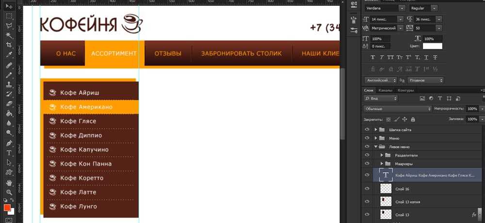 - Создавая пункты меню я не делал для каждого пункта отдельный текстовый слой. Можно это сделать в одном слое начиная каждый пункт с новой строки (через ентер), а потом просто отрегулировать меж строчный интервал в окне “Символ”