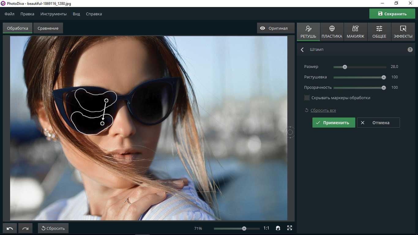 «Штамп» — универсальный инструмент, с которым легко справится даже новичок в области обработки фото. Ненужные детали убираются с помощью двух контейнеров — первый помещается на проблемную зону, а второй — на участок, откуда следует взять картинку для копирования. Контейнеры можно передвигать, чтобы подобрать для них оптимальное место.