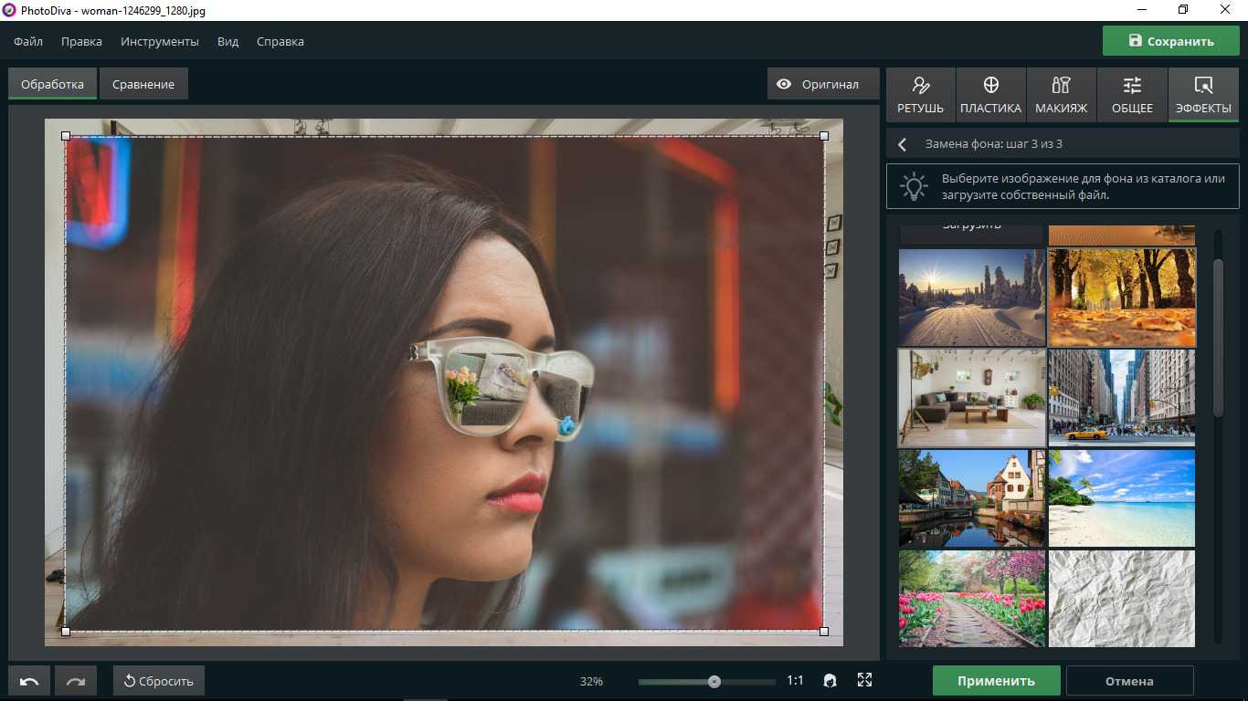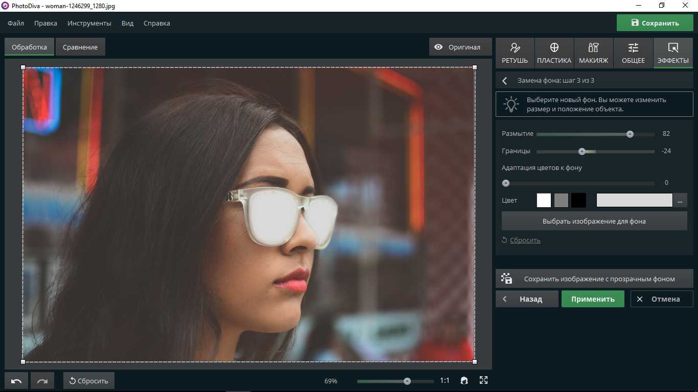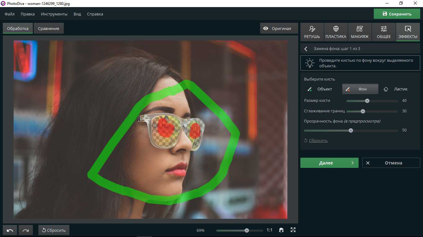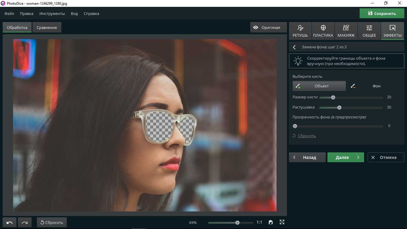 Если выбрать замену фона, то вы легко создадите новое отражение в очках или сделаете их абсолютно темными. Во вкладке «Эффекты» найдите «Замену фона» и обозначьте, где фон и объект на фото.