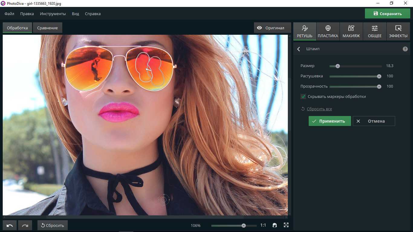 - «Штамп» — хороший и удобная опция, позволяющая быстро заменить область с ненужным отражением на другой подходящий наиболее подходящий фрагмент фото