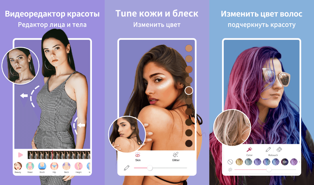 Утилита предлагает ретуширующие инструменты для нанесения виртуального макияжа – выровнять тон кожи, нанести тени, накрасить губы и сделать ретушь ваших волос в фотошопе можно за пару минут в автоматизированном режиме. Также вы легко удалите мешки под глазами, отбелите зубы и даже измените овал лица или форму носа. Есть и готовые наборы макияжа, разделенные на стили – естественный, тропический, звездный и др. Результат можно напрямую выгрузить в Фейсбук или Инстаграм.
