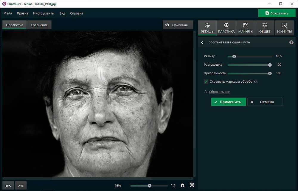 Во вкладке «Ретушь» вы найдёте «Восстанавливающую кисть». Этот простой инструмент способен творить настоящие чудеса по части преображения портретных снимков. Он идеально подходит для устранения глубоких морщин, складок в уголках глаз, на переносице и в носогубной области, маскировки пигментных пятен, капиллярной сетки и других возрастных изменений.