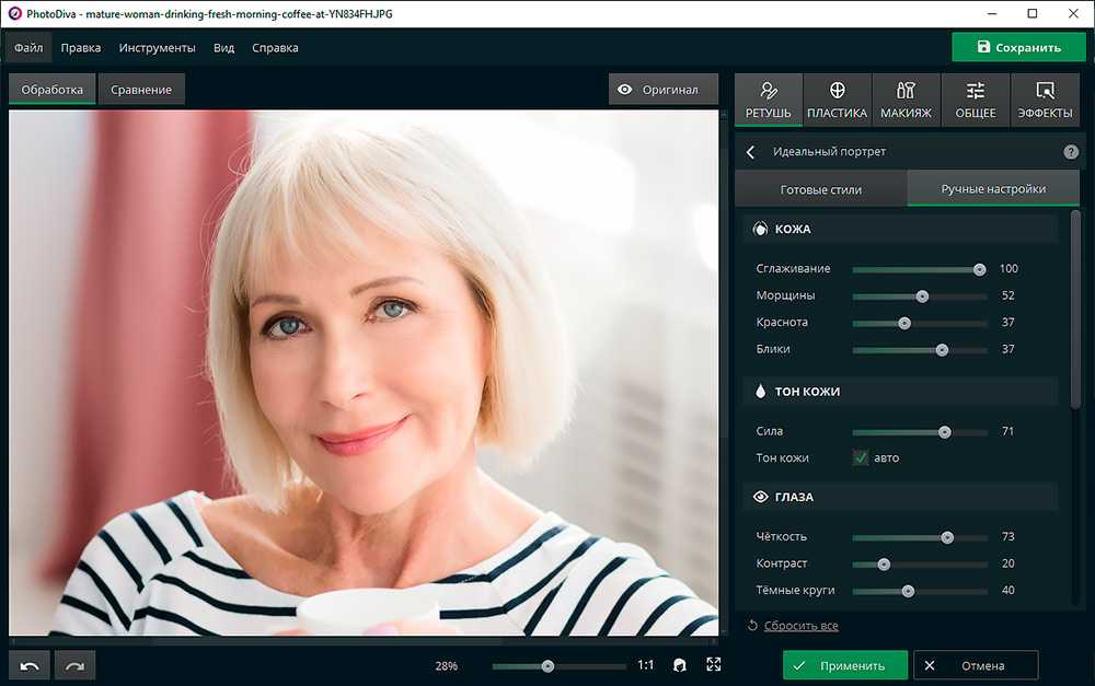 Вкладка с ручными настройками в программе для обработки лица на фото особенно пригодится, когда хочется стереть блики с кожи, разгладить ее и уменьшить красноту. При необходимости темные круги под глазами вы тоже без проблем уберете, а цвету губ придадите четкости и насыщенности. Не бойтесь пробовать разные варианты — неудачные попытки нетрудно отменить, вернув прежние настройки.