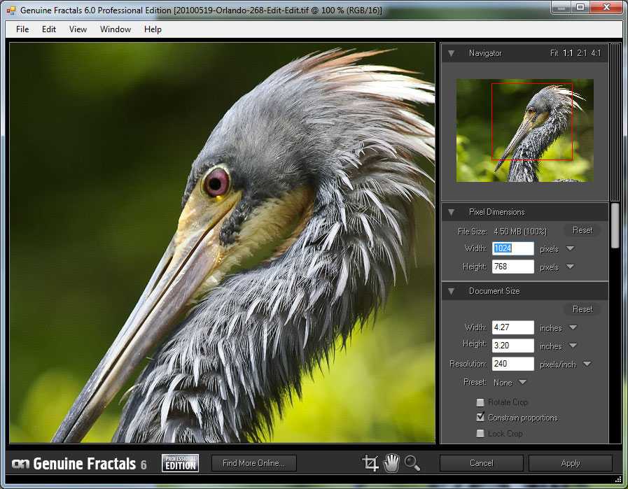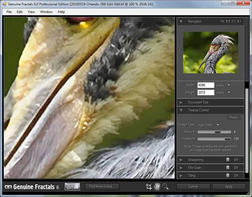 Как видите, я выбрал «Множество деталей”, потому что хотел сохранить максимально возможную детализацию для перьев и других участков. Вот как Genuine Fractals преобразовало изображение после того, как я нажал «Применить»: