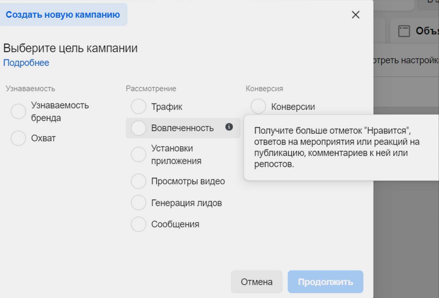 Например в Facebook Ads Manager можно быстро разобраться с непонятными целями рекламы и установить нужную. Скриншот: Skillbox