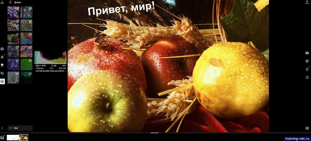 - Инструмент “Текст”: Добавляйте и изменяйте текст в различных стилях и типах шрифтов на изображениях.