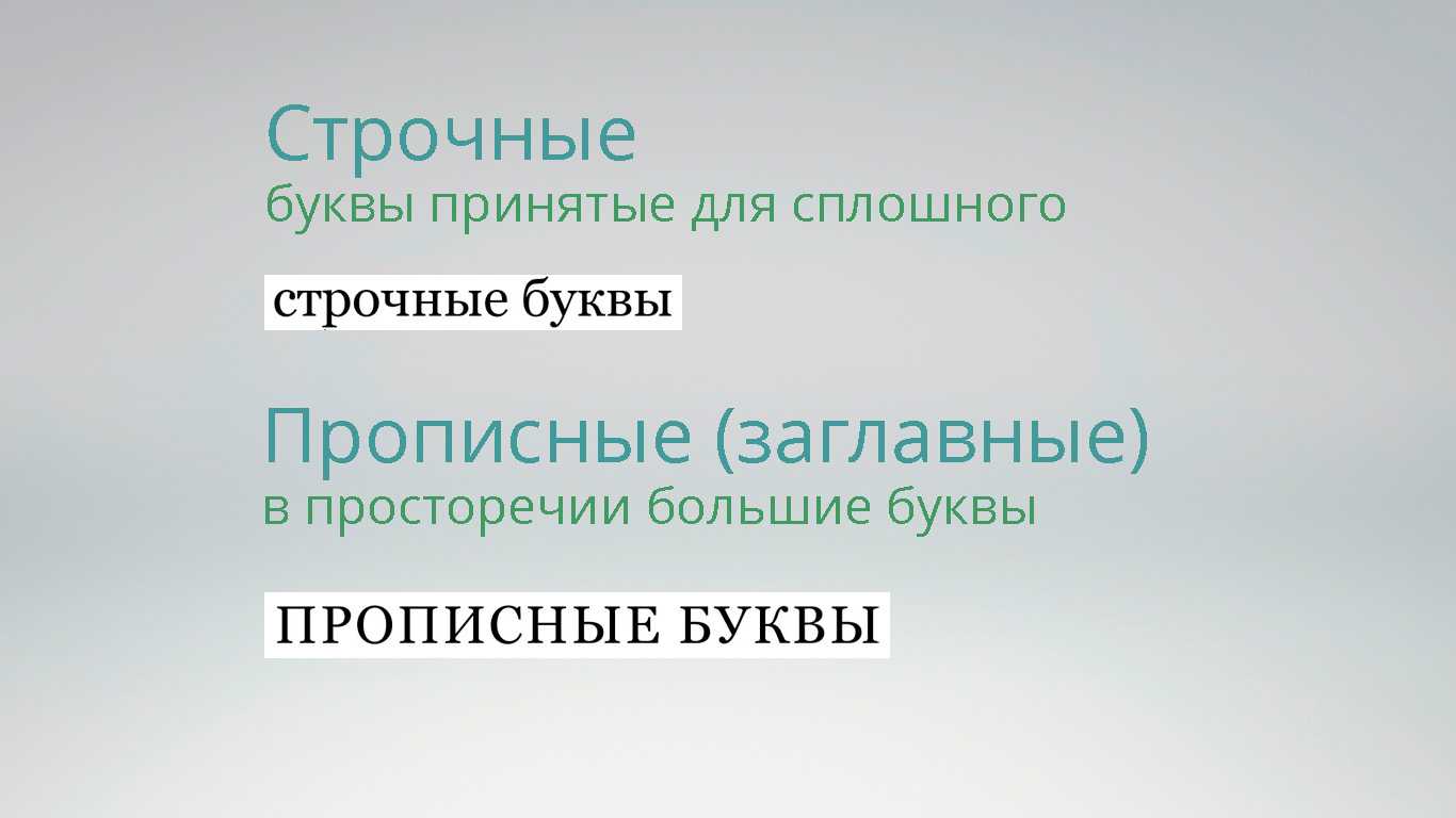 Строчные буквы — буквы принятые для сплошного набора текста.Прописные (заглавные, в народе “большие”) буквы используются для прописных знаков, с них начинается предложение или имя собственное.