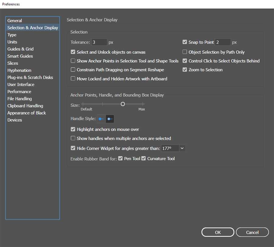 - Show Anchor Points in Selection Tool and Shape Tools — Показывать узловые точки при использовании инструментов выделения и рисования фигур.