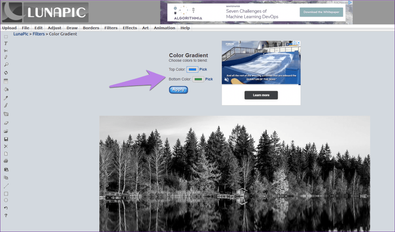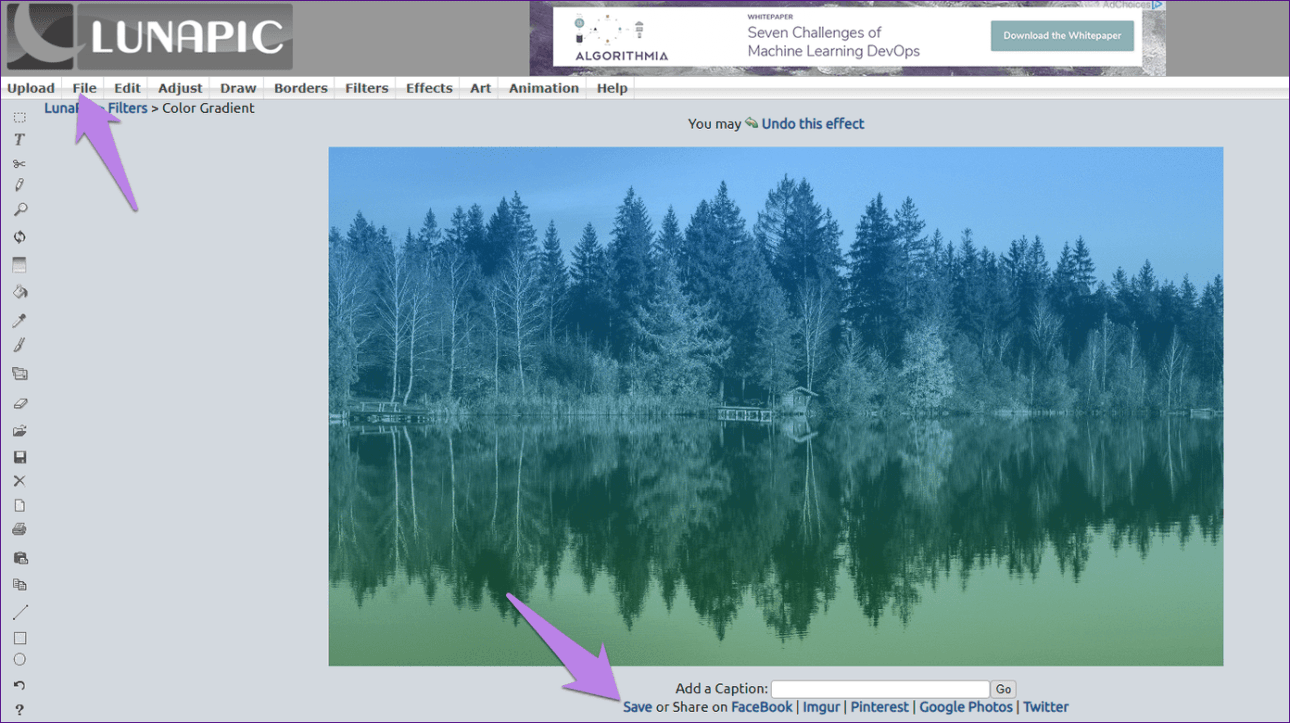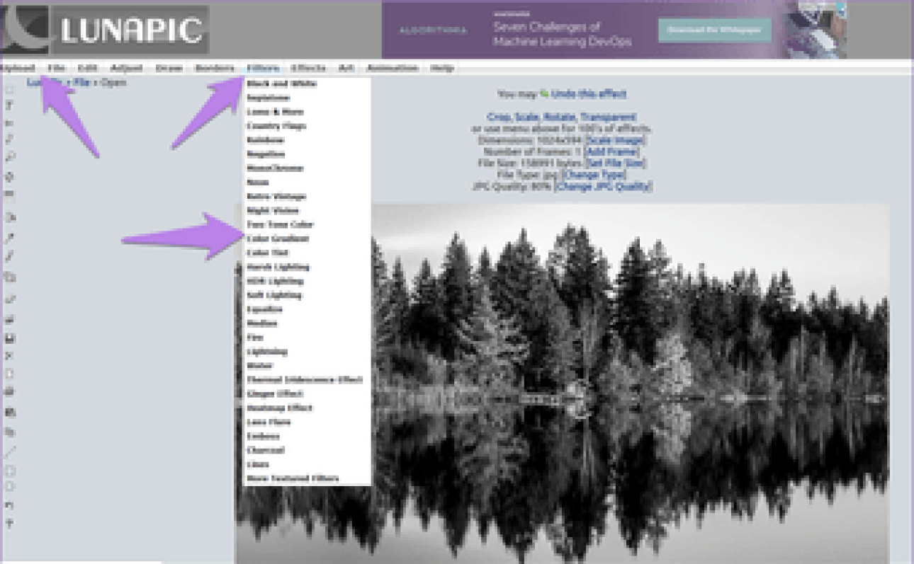Чтобы раскрасить без Photoshop в Lunapic, откройте веб-сайт и нажмите кнопку «Загрузить», чтобы добавить изображение. После добавления изображения нажмите Фильтры> Цветовой градиент или Двухцветный цвет.