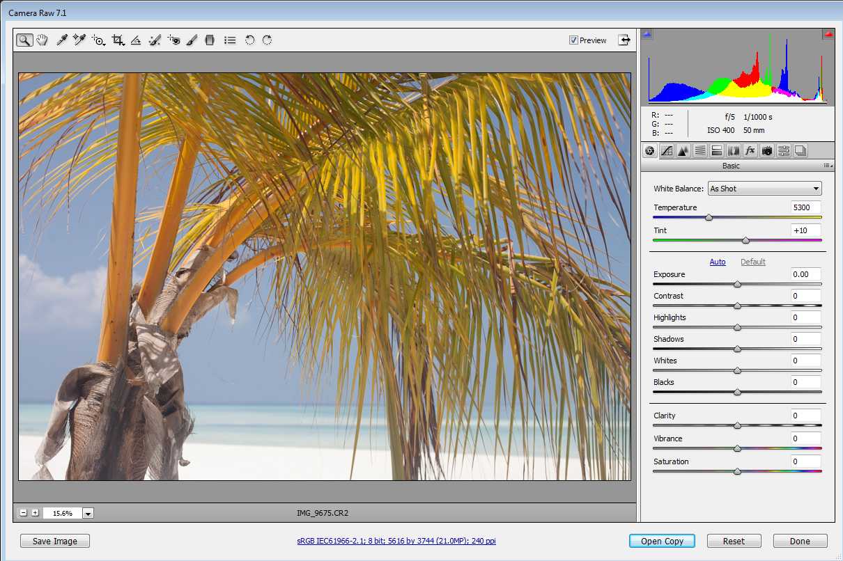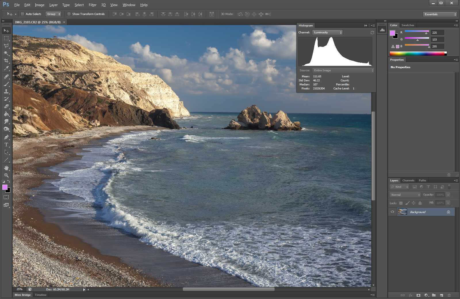 В процессе обработки фотографий вам часто придется сталкиваться с понятием «Гистограмма» (Histogram). На самом деле гистограмма – это график. Если вы делаете все правильно и снимаете фотографии в формате RAW, то с гистограммой вы столкнётесь уже в Camera RAW до загрузки основной программы. Область с цветными графиками в верхнем правом углу — и есть гистограмма. Разными цветами обозначены каналы Red, Green, Blue и суммарное распределение яркости.