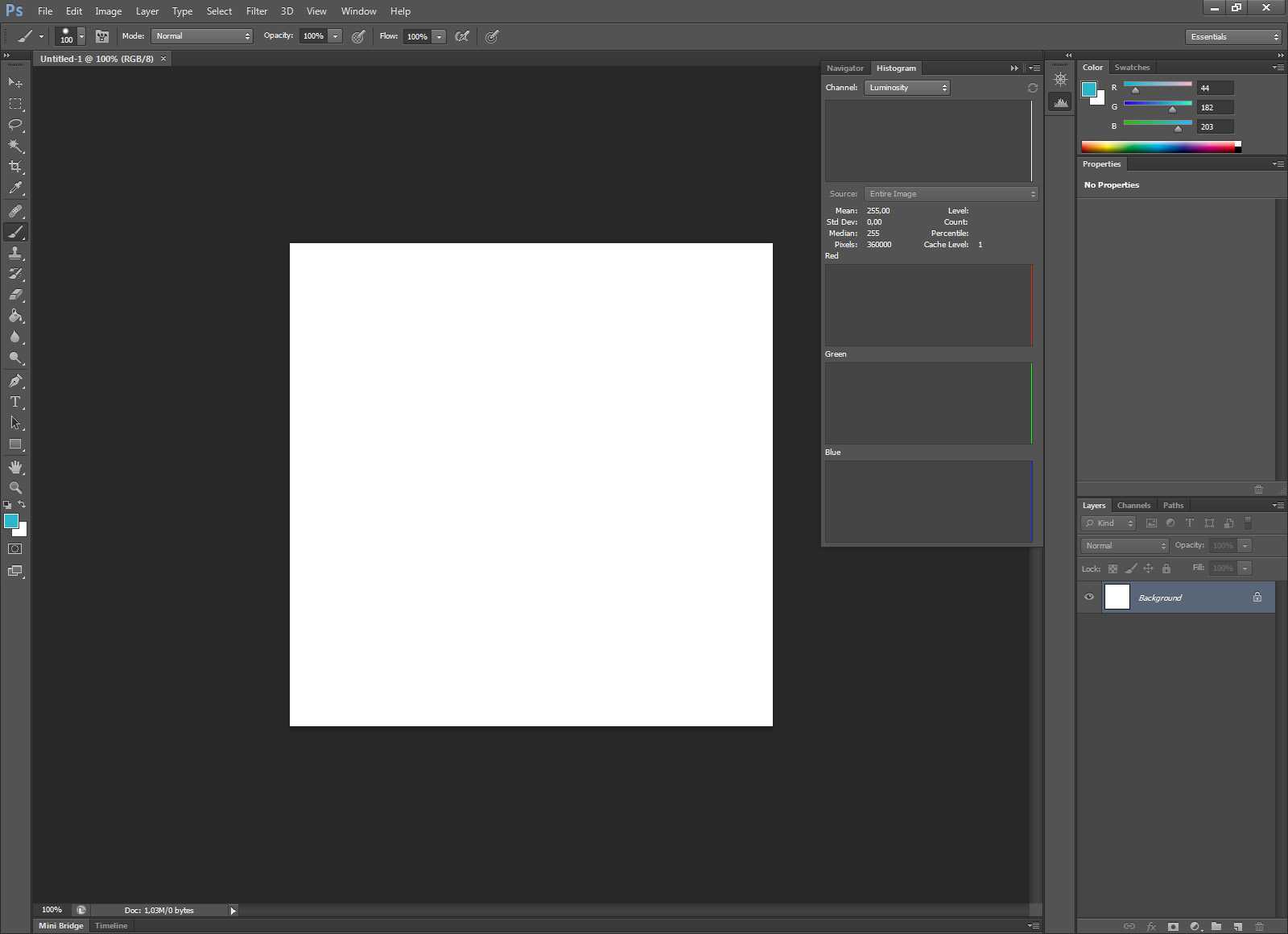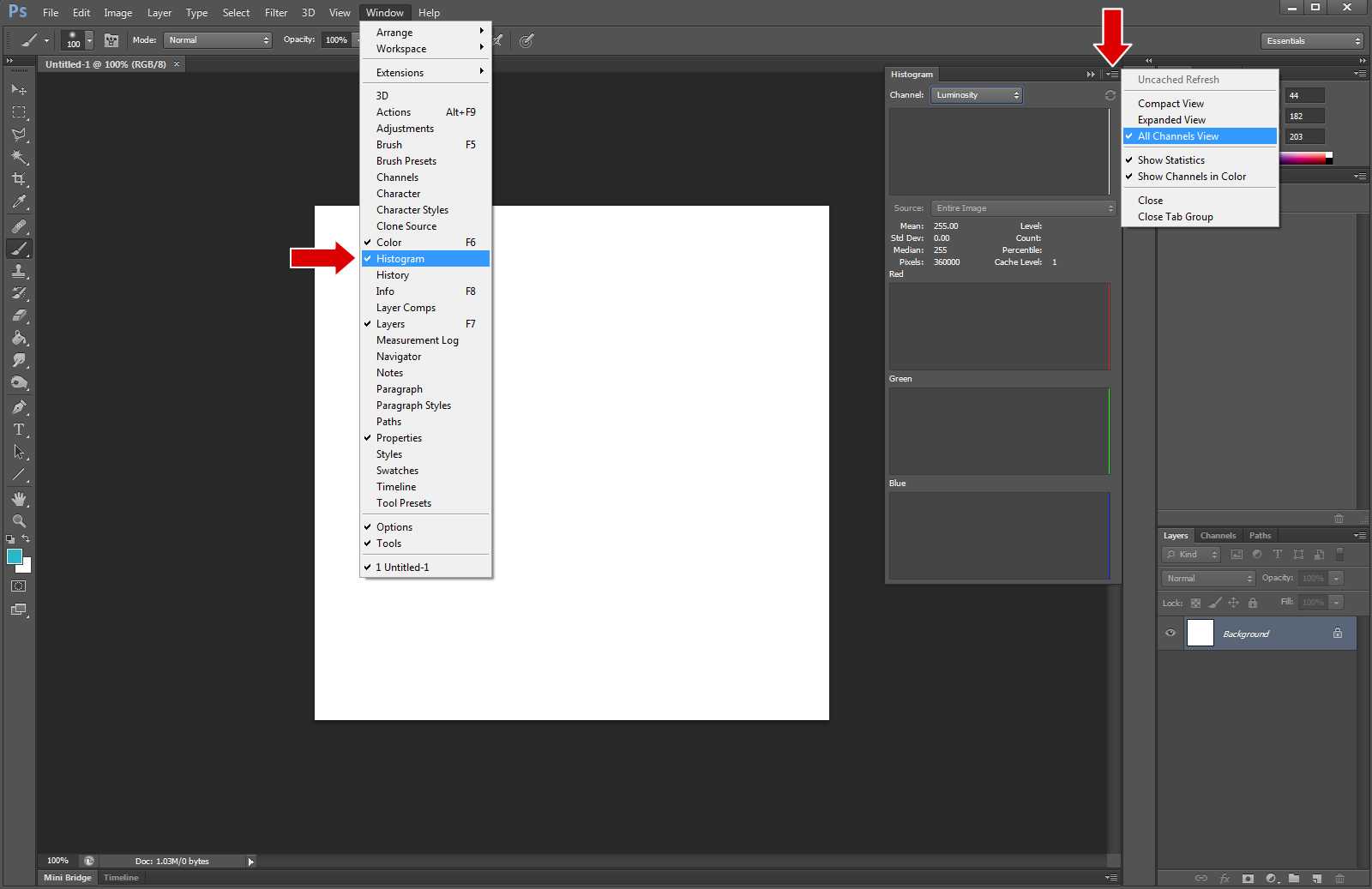 Чтобы понять смысл такого отображения, начнем с более простых примеров. Создайте новый файл c разрешением 600×600 пикселей белого цвета. Откройте панель «Гистограмма» (Histogram), переведите ее в режим «Отображать все каналы» (All Channels view) и «Показывать каналы в цвете» (Show Channels in Color). В выпадающем списке поставьте «Освещенность» (Luminosity).