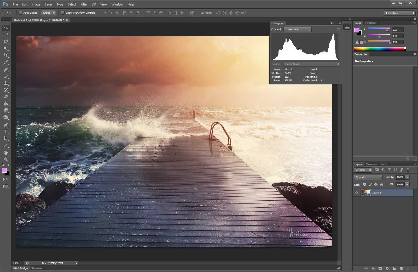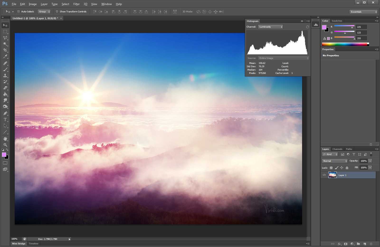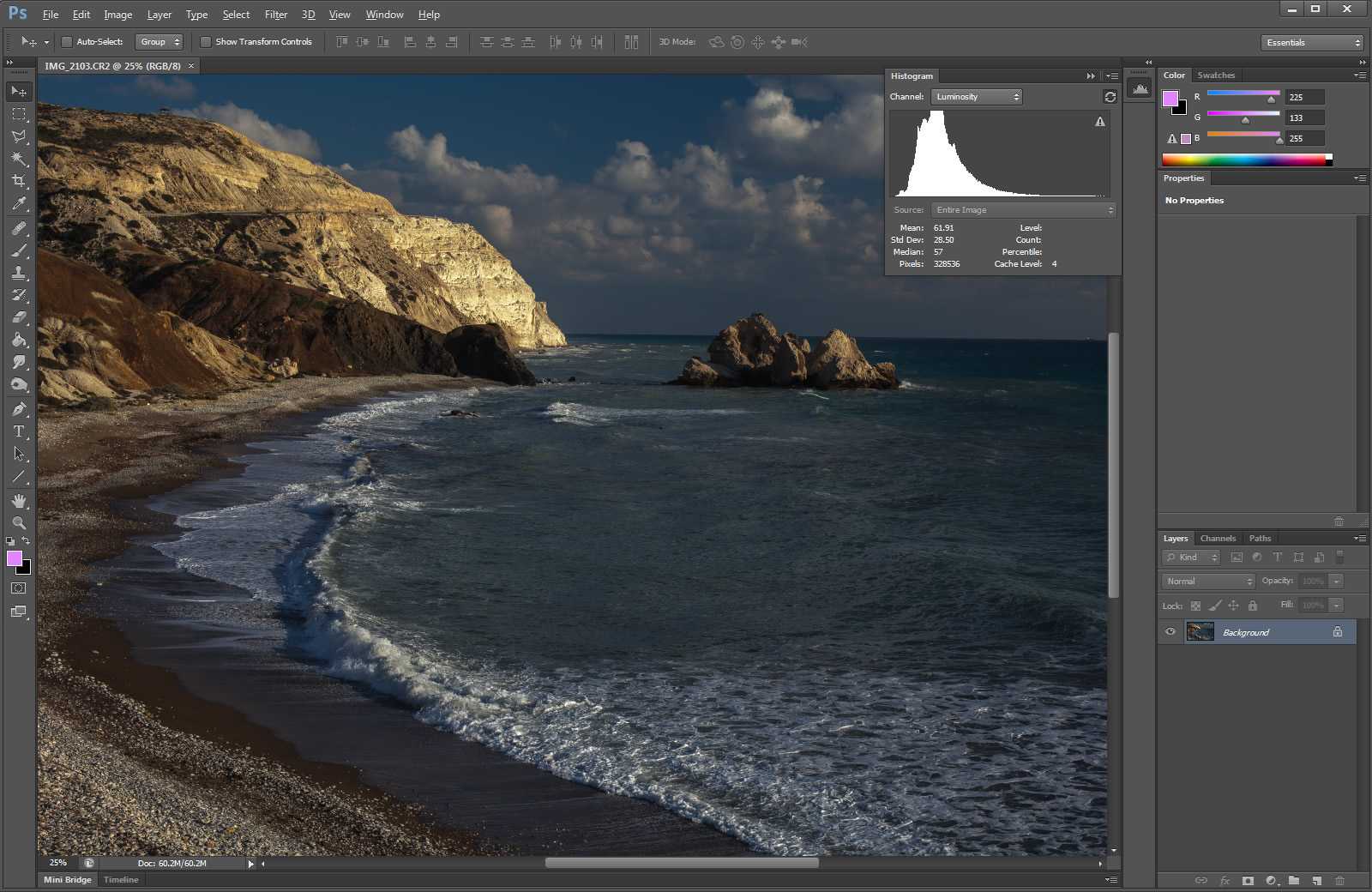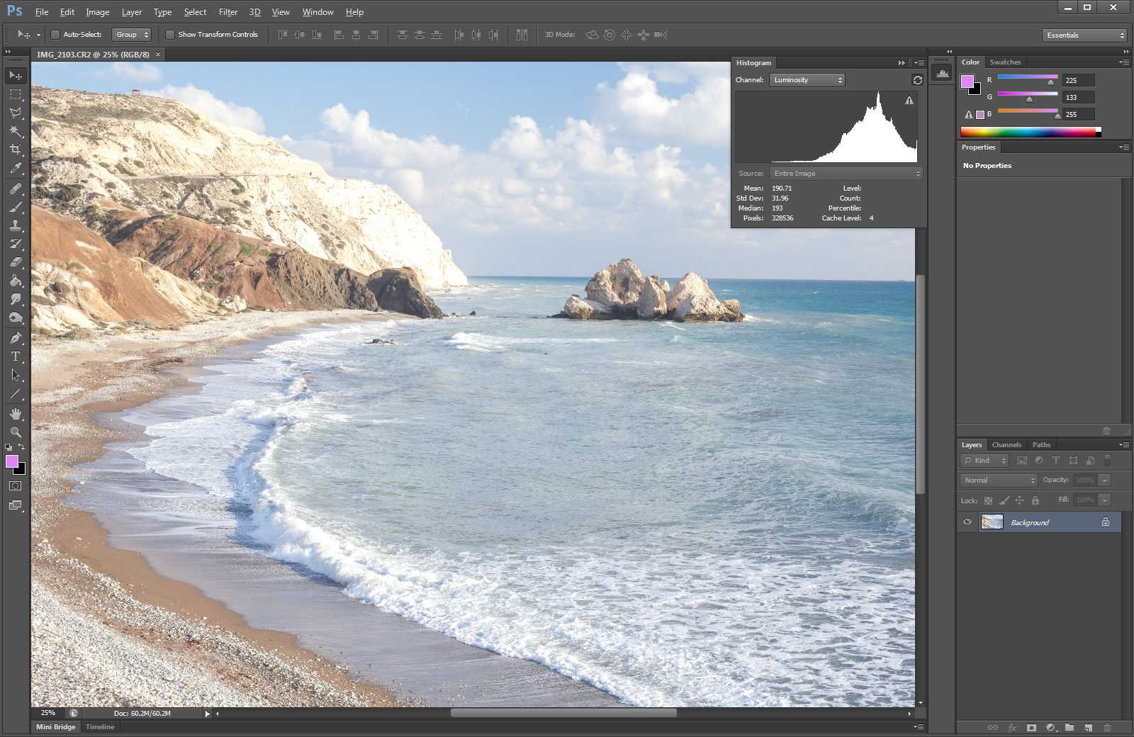Теперь откроем необработанную фотографию в Adobe Photoshop и посмотрим, как выглядит ее гистограмма. Сделайте панель «Гистограмма» (Histogram) более компактной — графики каналов нам больше не понадобятся. Переключите режим обратно на «Освещенность» (Luminosity), если он изменился на «Цвет» (Color). При правильно снятом кадре динамический диапазон будет большой, или, как говорят фотографы, – широкий: