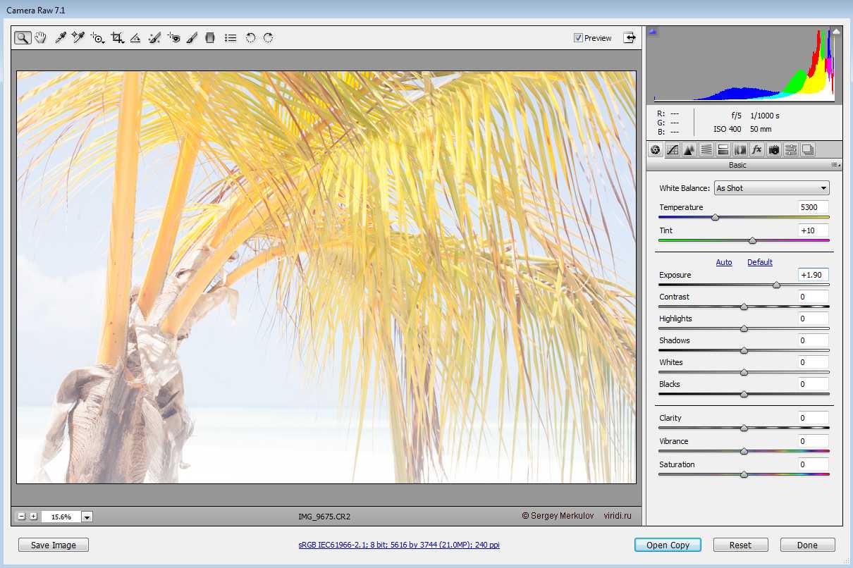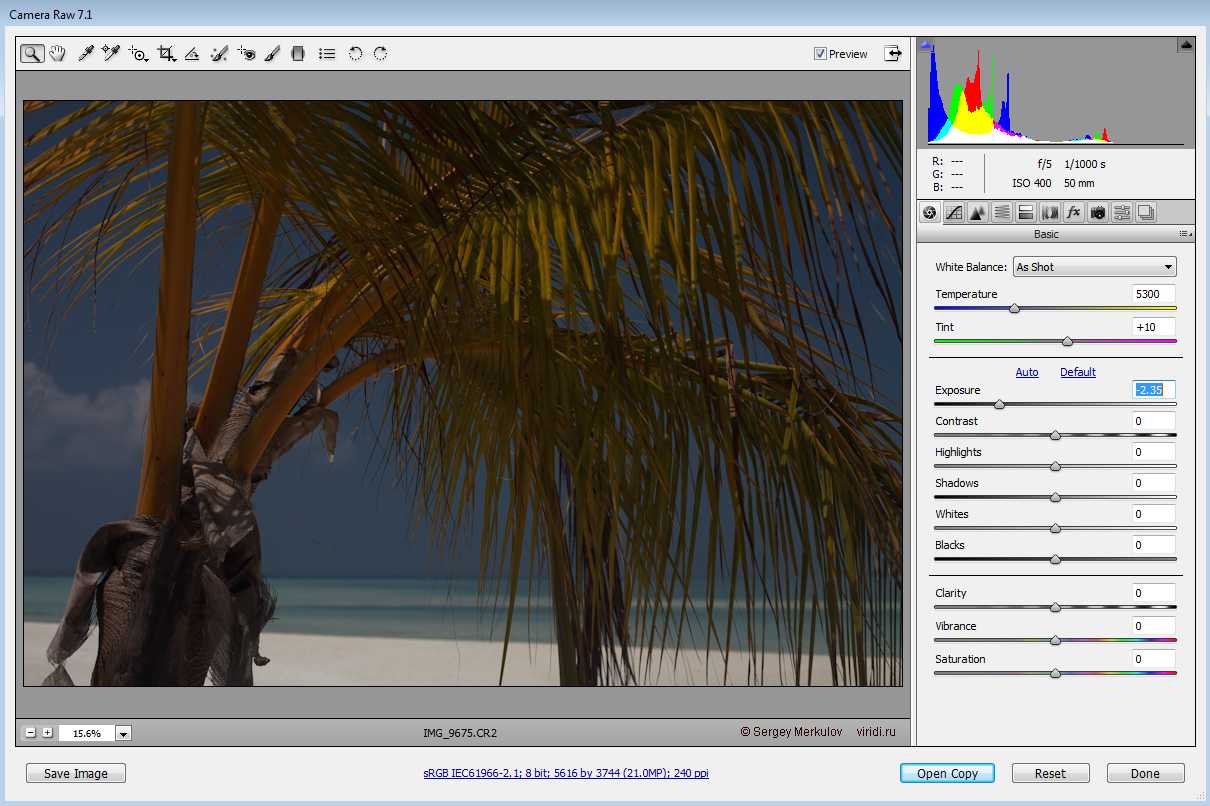Подвигайте ползунок «Экспозиции» (Exposure), чтобы понаблюдать, как меняется освещенность снимка и значения на графике.