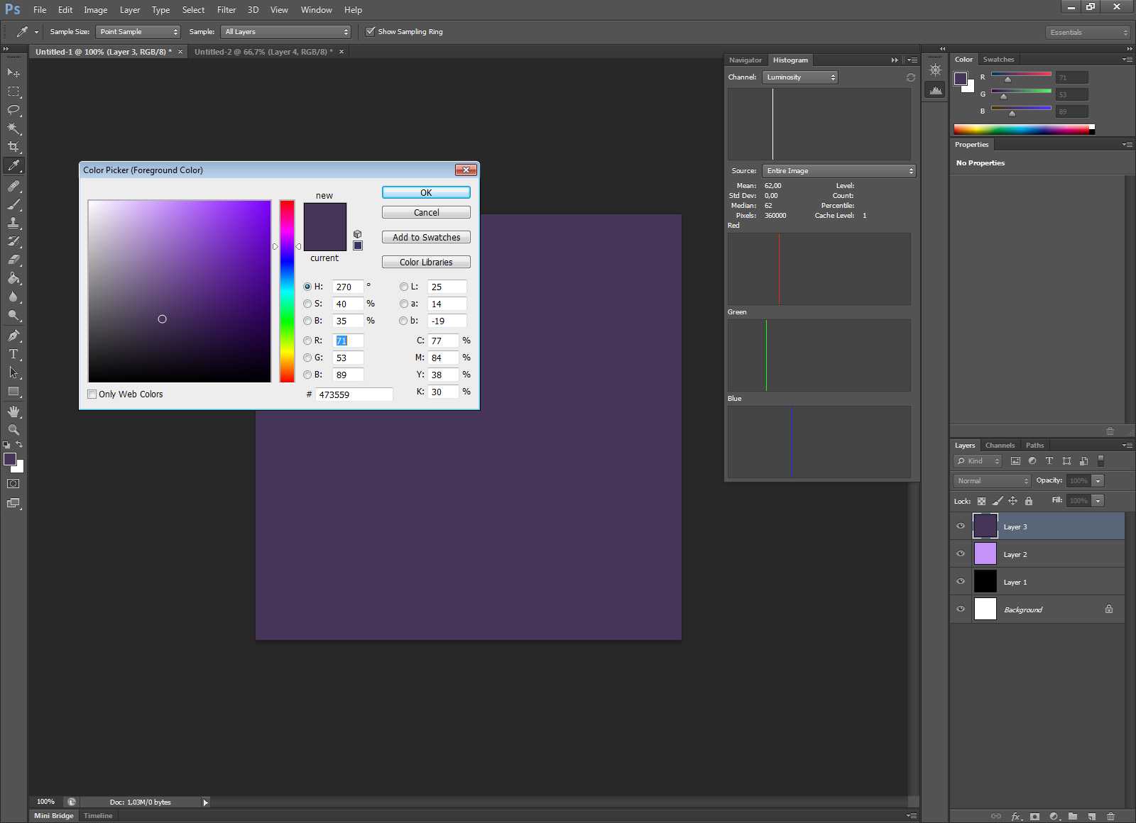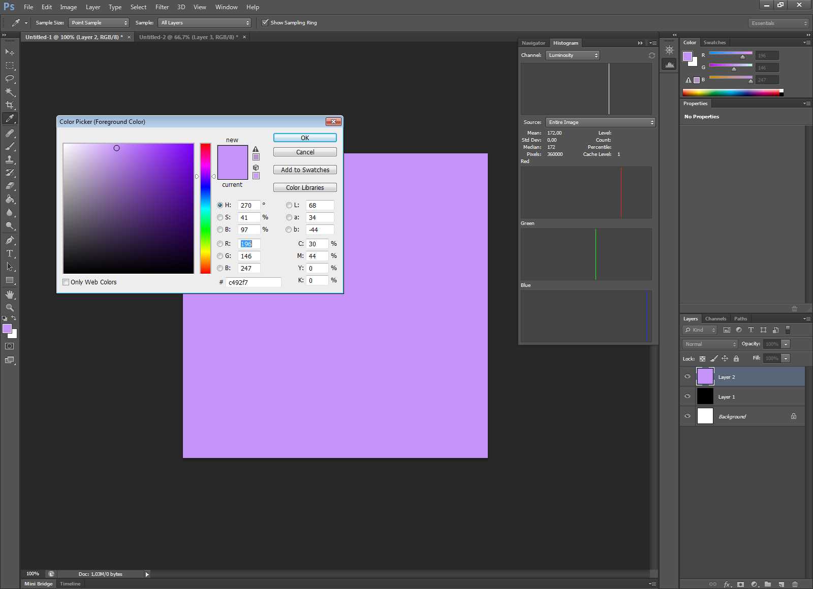 Обратите внимание, как каналы RGB создают выбранный нами цвет. Значения на графике показывают числа по каналам R:196, G:146, B:247