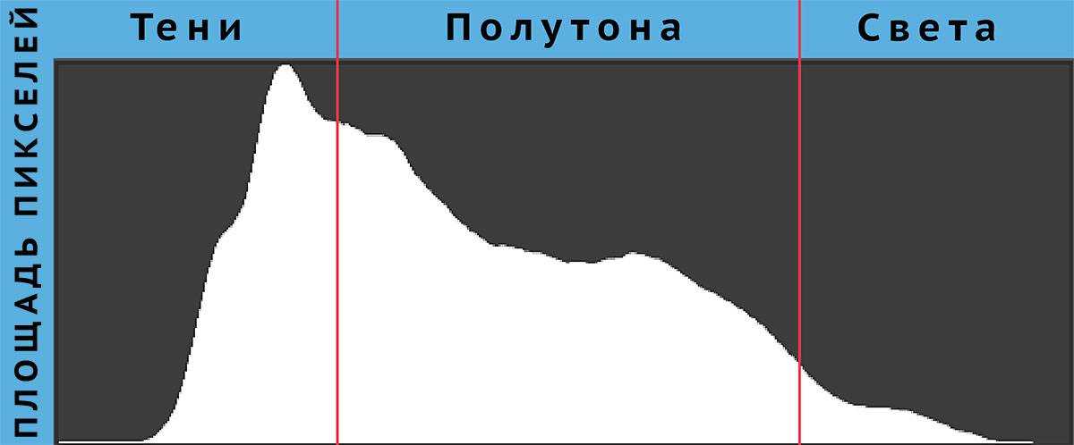 - Если график гистограммы выходит за левый край, то мы потерям информацию в тенях, либо тени будут плохо читаемы
