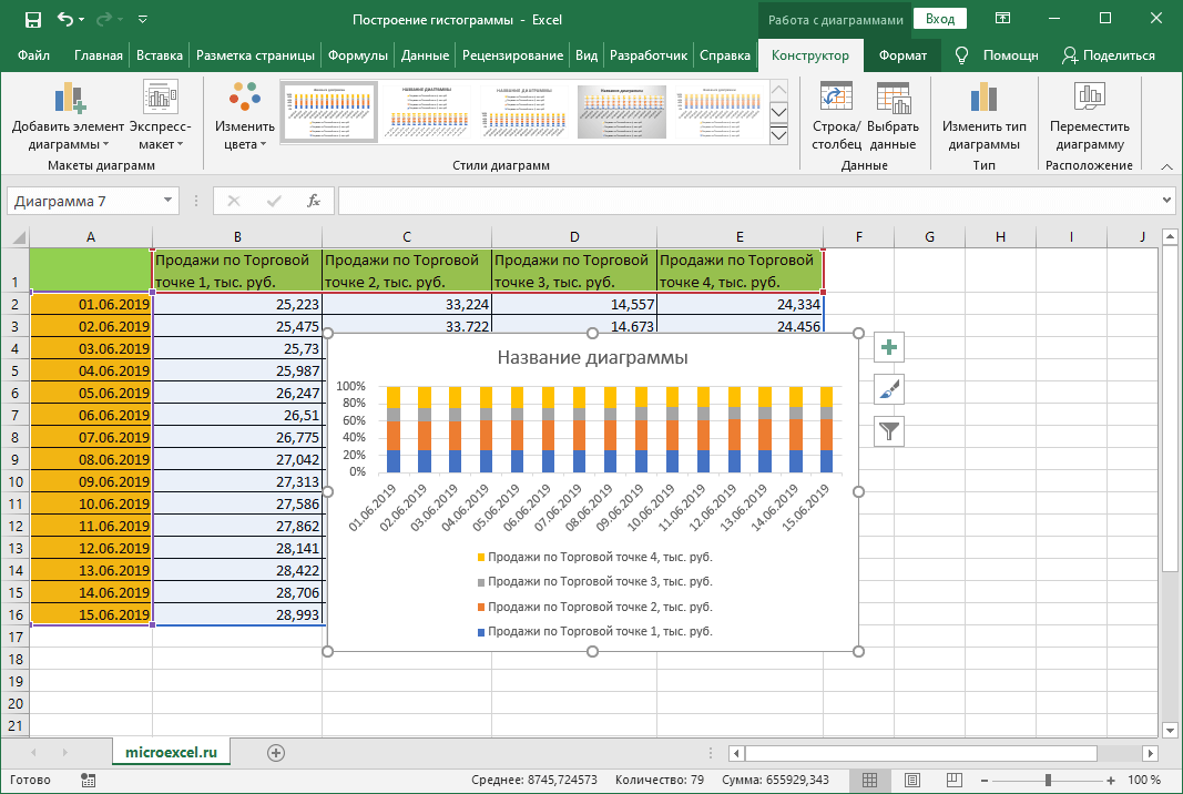 Примечание: в гистограммах с накоплением один столбец содержит сразу несколько значений. В нашем случае – это данные по всем четырем торговым точкам за конкретную дату.