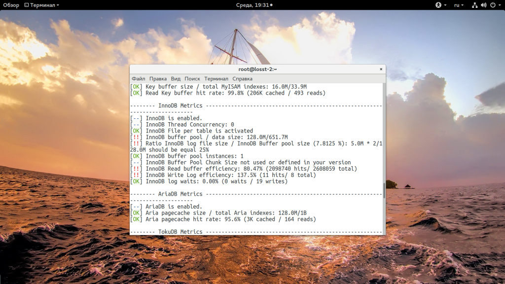 Далее необходимо провести тест базы данных. Оптимизация производительности будет основана на выявленных проблемах. Тест запускается скриптом # perl ./mysqltuner.pl . Он выдает полную статистику работы базы. Все проблемные места обозначаются красным восклицательным знаком .