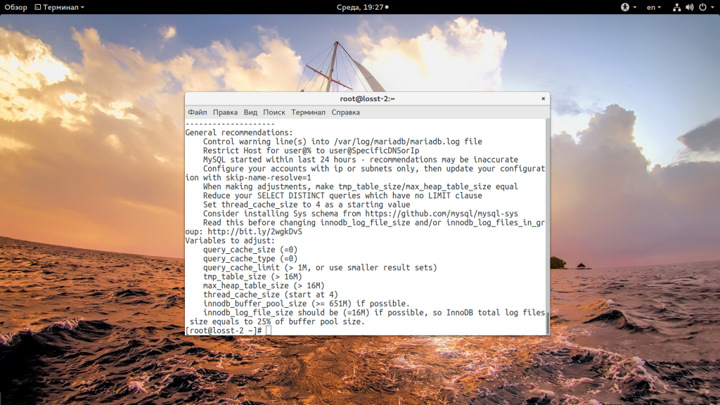 Следует помнить, что параметры изменяются согласно рекомендациям, которые выдает утилита. Нельзя бездумно копировать параметры из статьи и применять их к собственной базе данных. В ином случаем можно столкнуться с рядом практических проблем. Например, недостаточным размером буфера движка таблиц (InnoDB buffer pool).