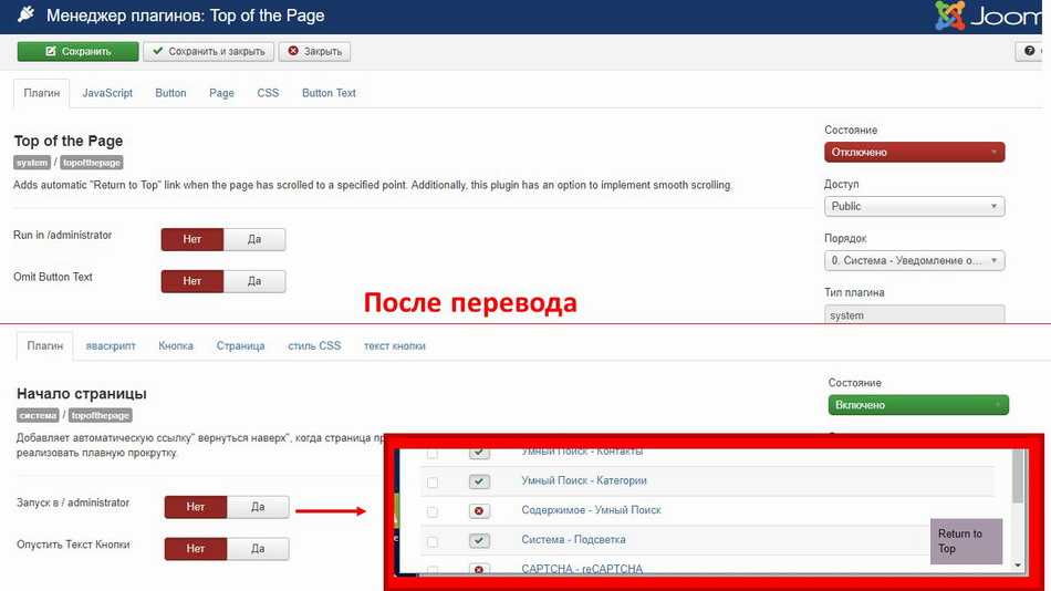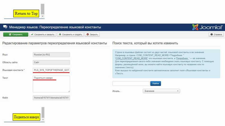 - С помощью менеджера языков joomlaможно изменить текст – с Returntotop на «Подняться наверх».