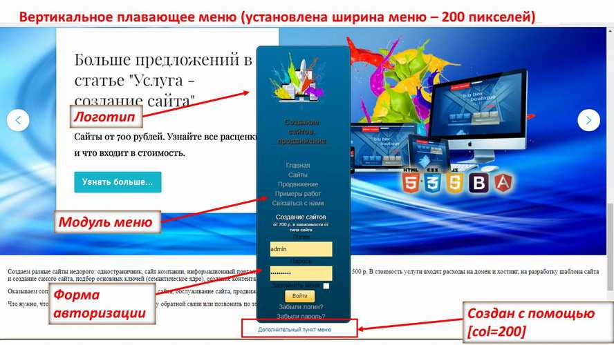 - добавить новый столбец (или строка, в зависимости от ориентации меню), прописать ширину в пикселях – . Перед этим «шорткодом» следует написать название столбца – будет отображаться как анкор (переход возможен на материал или веб-страницу – в зависимости от выбранного типа меню при создании этого пункта).