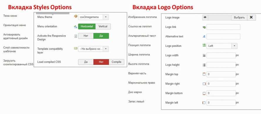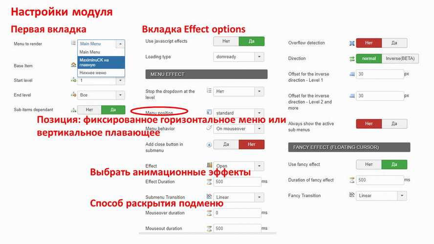 Зайдём в модуль и познакомимся с настройками. Определим ориентацию и позицию меню (фиксированное или плавающее, перетекающее в плавающее, верхнее меню или по низу), зададим размеры.