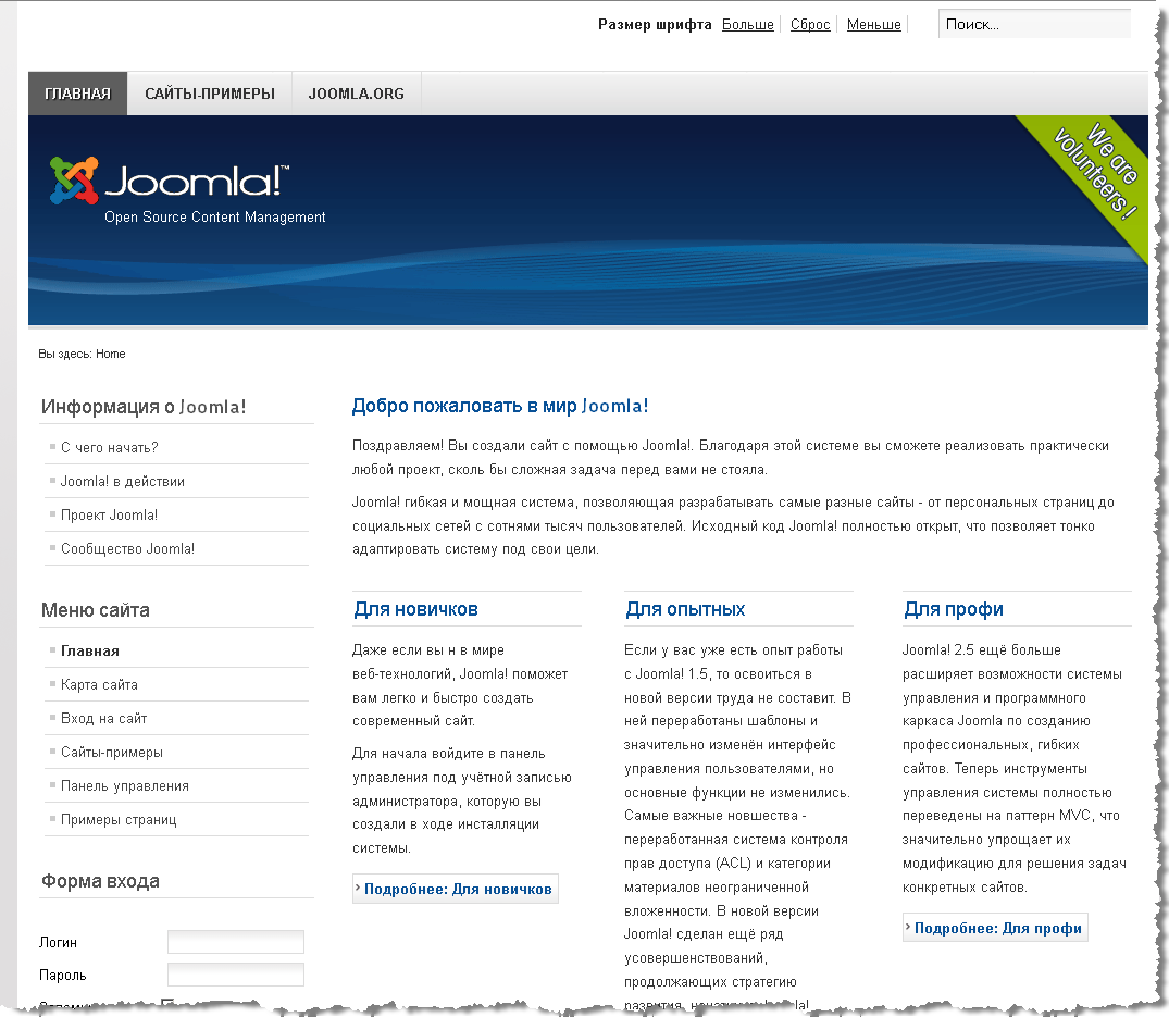 Работу шаблона административной панели видят только те пользователи сайта, которым разрешён к ней доступ. А это очень узкий круг пользователей. Для большинства сайтов на Joomla – это только веб-мастер или администратор. Так что, по большому счёту, двух шаблонов для административной панели вполне достаточно. Но если нужно что-то особенное, то тогда ищите, скачивайте, покупайте или пишите сами.В отличие от шаблонов для административной панели, шаблоны сайта видны всем посетителям. Таких шаблонов великое множество, они достаточно просты и удобны для редактирования. Написанием шаблонов занимаются и отдельные дизайнеры и целые студии. Соответственно шаблоны могут быть как платными, так и бесплатными. Вот так выглядит бесплатный шаблон Beez2.