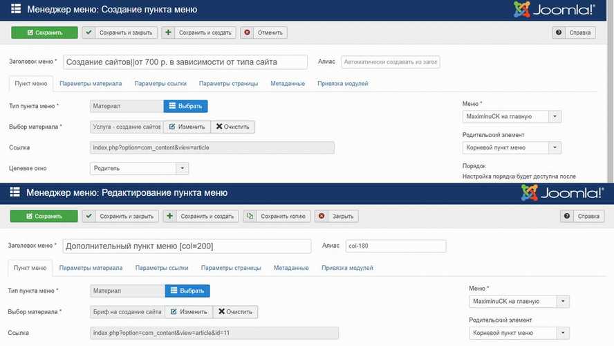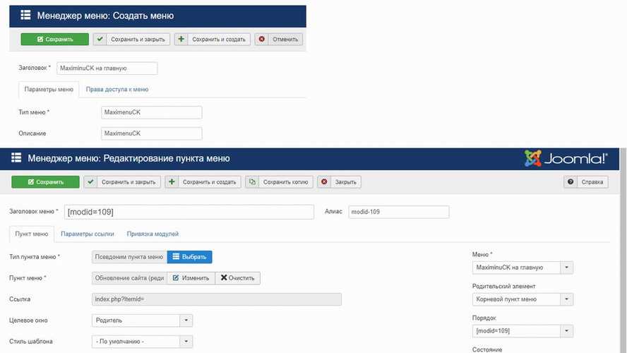 Воспользуемся некоторыми из них. Создадим меню, которое выведем на сайт с помощью модуля MaxiMenuCK. Создадим пункты.