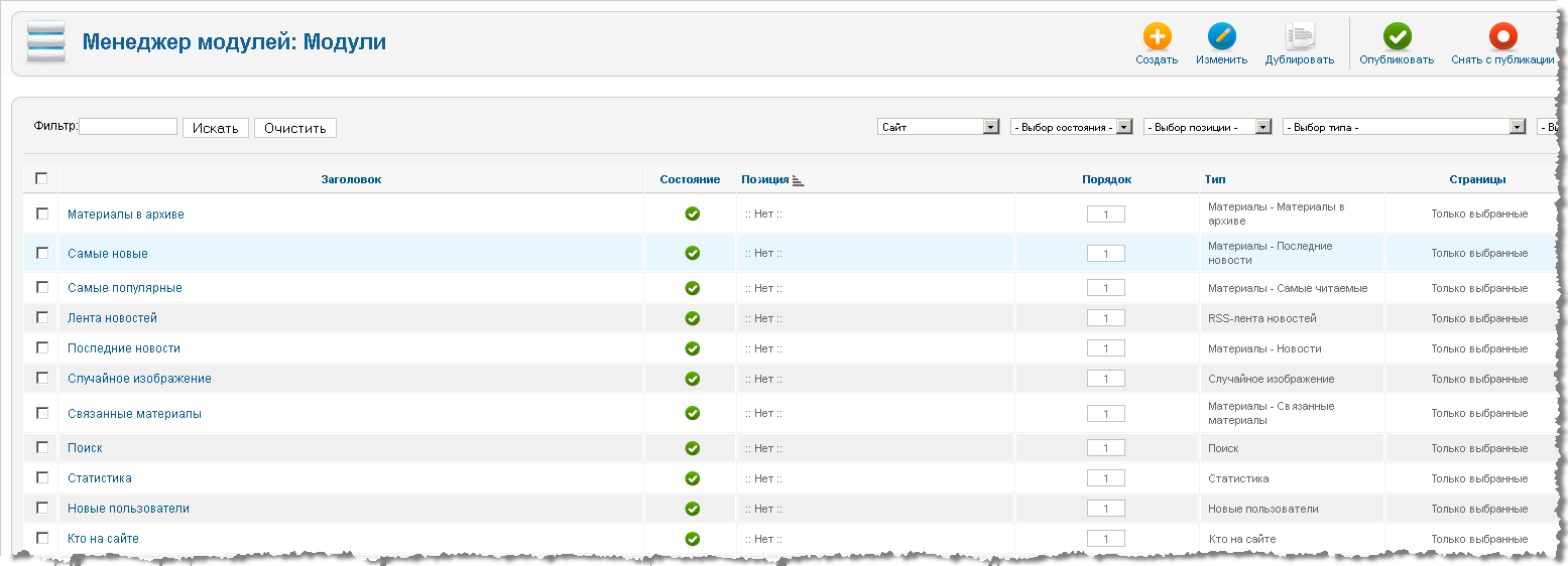 Конечно, бывают случаи, когда нужно отобразить информацию модуля в основном контенте, но о том, как это сделать мы поговорим в одной из следующих статей.Доступ к модулям сайта осуществляется с помощью «Менеджера модулей», который находится в меню «Расширения» панели управления Joomla сайта.