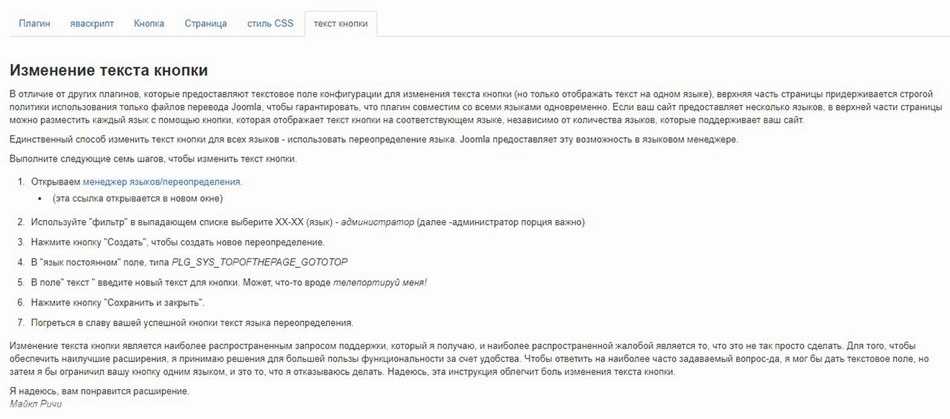 На последней вкладке представлены инструкции по настройке перенаправления с английской надписи на русскую («Вернуться наверх» вместо Returntotop).