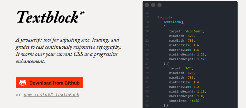 Textblock Glyphic – это инструмент JavaScript, который регулирует размер, межстрочное расстояние и угол наклона вашего шрифта, делая его полностью адаптивным. Это прогрессивное улучшение подстраивает текст под любую ширину области просмотра или ориентацию устройства.