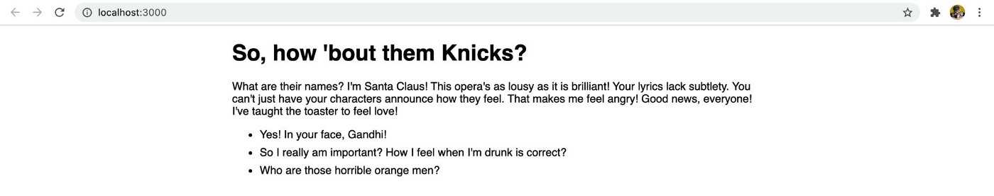 const content = { header: `So, how 'bout them Knicks?`, intro: `What are their names? I'm Santa Claus! This opera's as lousy as it is brilliant! Your lyrics lack subtlety. You can't just have your characters announce how they feel. That makes me feel angry! Good news, everyone! I've taught the toaster to feel love!`, list: }