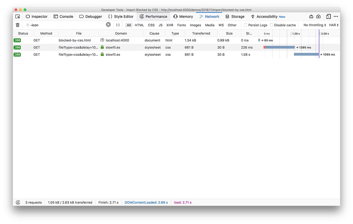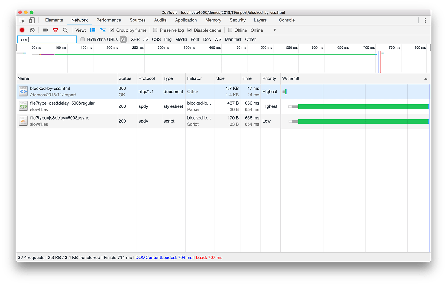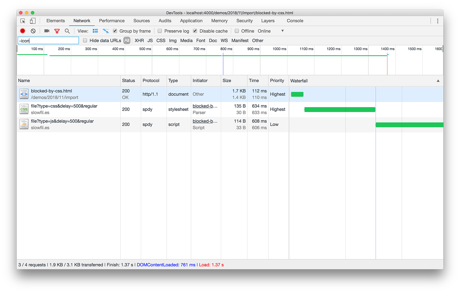 Предыдущий раздел был про то, как другие ресурсы могут тормозить CSS (из-за глюков, как оказалось), а здесь речь пойдет о том, как CSS может нечаянно задержать загрузку последующих ресурсов, прежде всего JavaScript, асинхронно подгружаемого кодом наподобие такого: