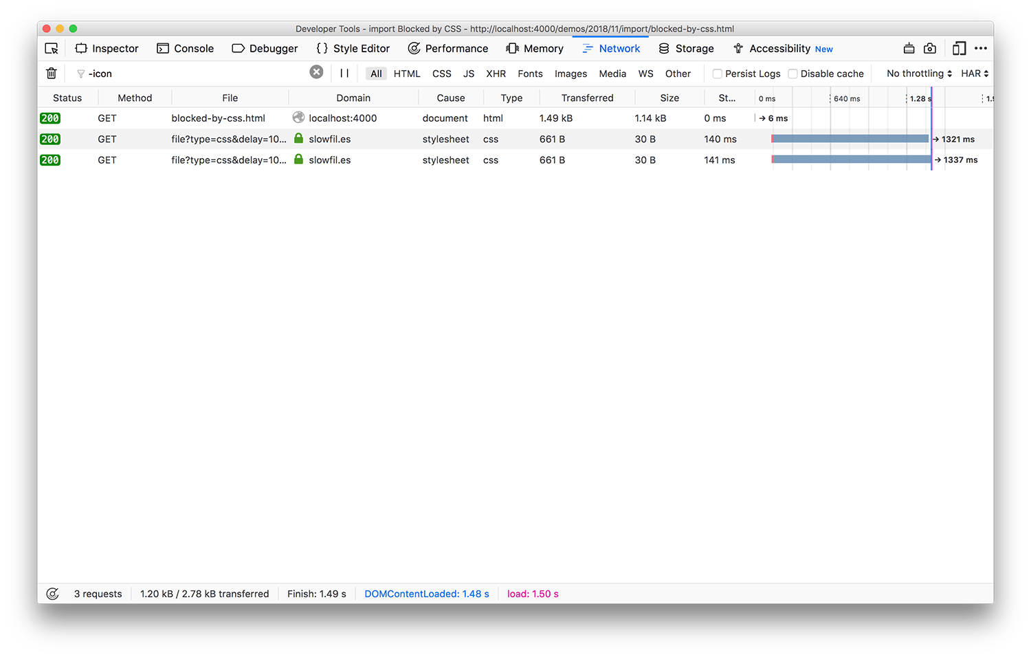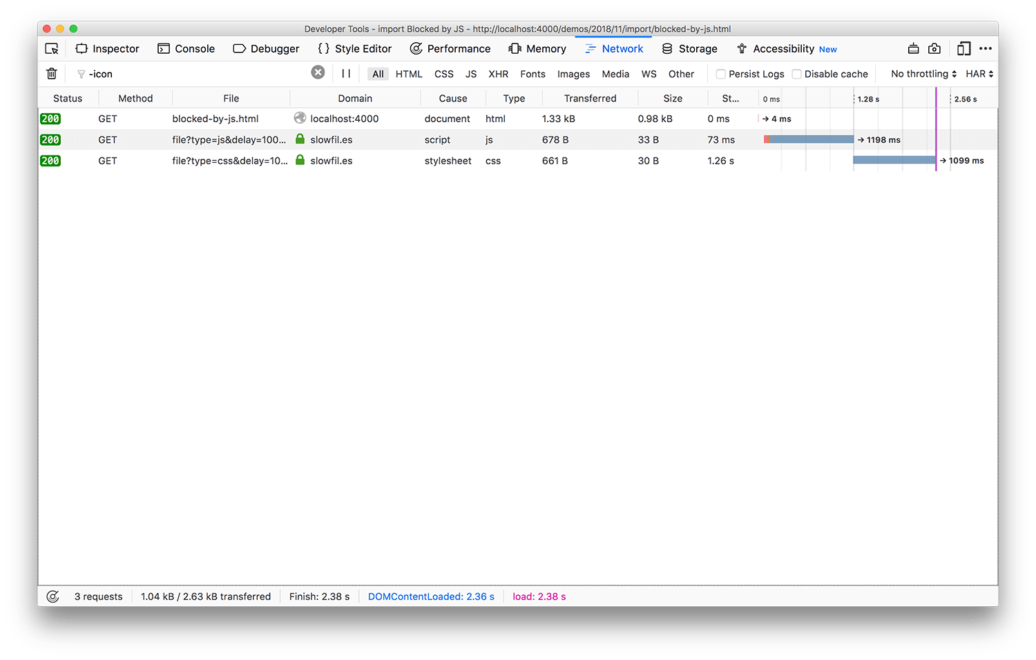 Здесь хорошо видно, что таблица стилей из не начинает загружаться до завершения JavaScript-файла.