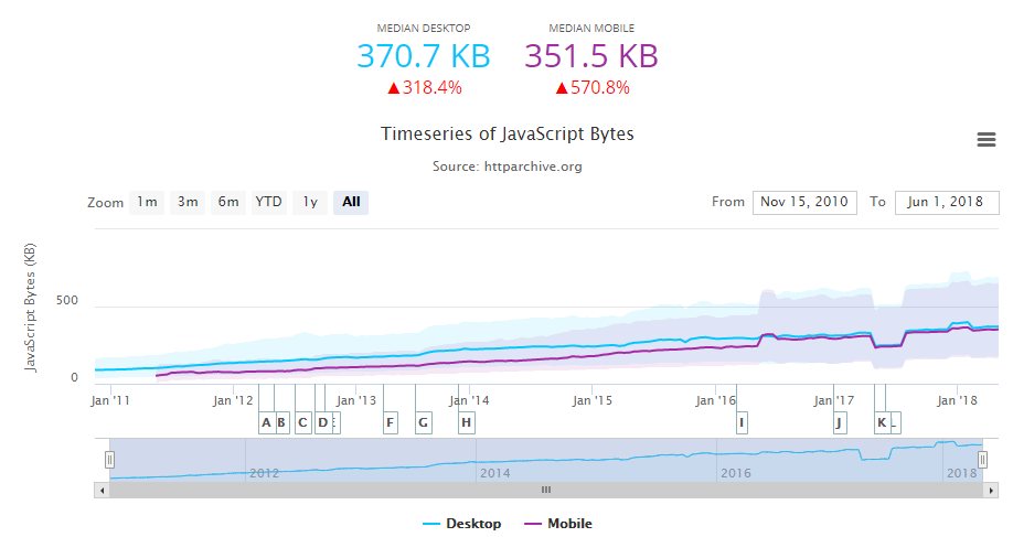 По статистике HTTP Archive, в июне 2018 года средний размер веб-страницы в интернете составил1720 КБ. За восемь лет он вырос в 3,7 раза. Есть несколько причин такого «ожирения» страниц, в том числе увеличение размера графических изображений (с 226 до 890 КБ, в 3,8 раза). Но в относительных цифрах за восьмилетний период сильнее всего выросла доля JavaScript, то есть внешних файлов .js, которые загружаются вместе со страницей HTML. Их объем увеличился с 89 до 371 КБ, то есть в 4,18 раза!