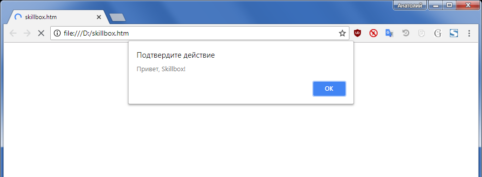 В нашем примере программу alert(«Привет, Skillbox») мы сохраняем в отдельный файл skill.js, а относительный или абсолютный путь к нему прописываем между тегами <script>…</script> с атрибутом src=»».