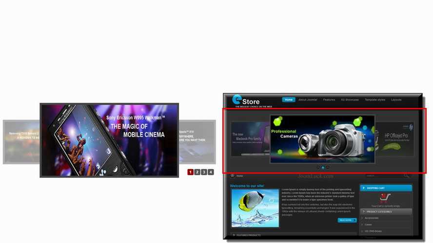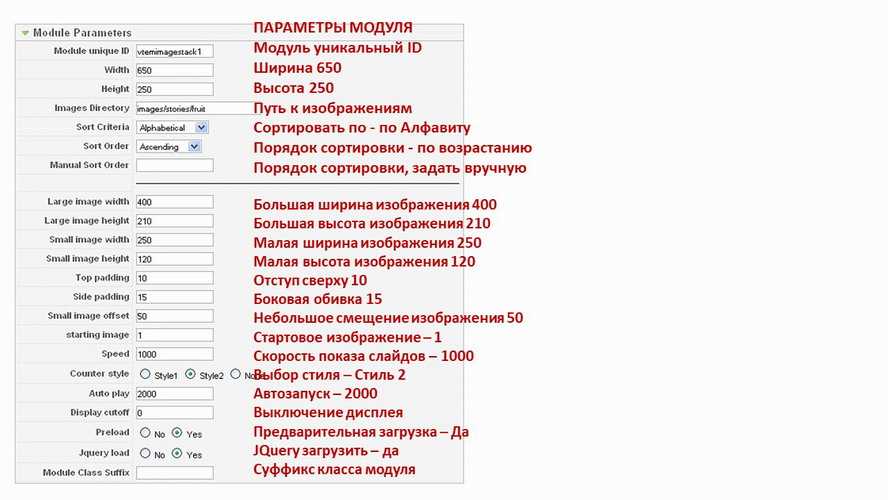 Модулем проста управлять: достаточно прописать путь к папке, задать размеры, установить эффекты (задать стиль, время, скорость). Изображения выводятся из папки медиа-менеджера джумла. Можно настроить размеры самого слайдера и картинок.