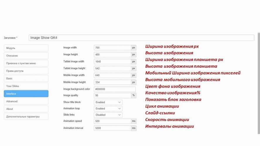 Открыв модуль, вы увидите несколько вкладок, среди которых будут стандартные настройки Joomla. На одной из вкладок (Basic) можно выбрать стиль – один из 20. Image Show GK4 предоставляет возможность корректировки CSS или через дополнительные параметры во вкладке Interface (ширина, высота, фон, качество изображения, навигация, скорость прокрутки, временной промежуток, эффекты при смене изображений – кстати, набор настроек меняется от стиля к стилю).