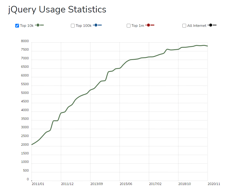 Если перейти к статистике, то многие крупные компании, используют jQuery в своих приложениях и сайтах. При этом растущий тренд продолжается, несмотря на очень горячие дискуссии в ИТ сообществах на тему: «Стоит ли использовать jQuery или нет в 2021 году?»