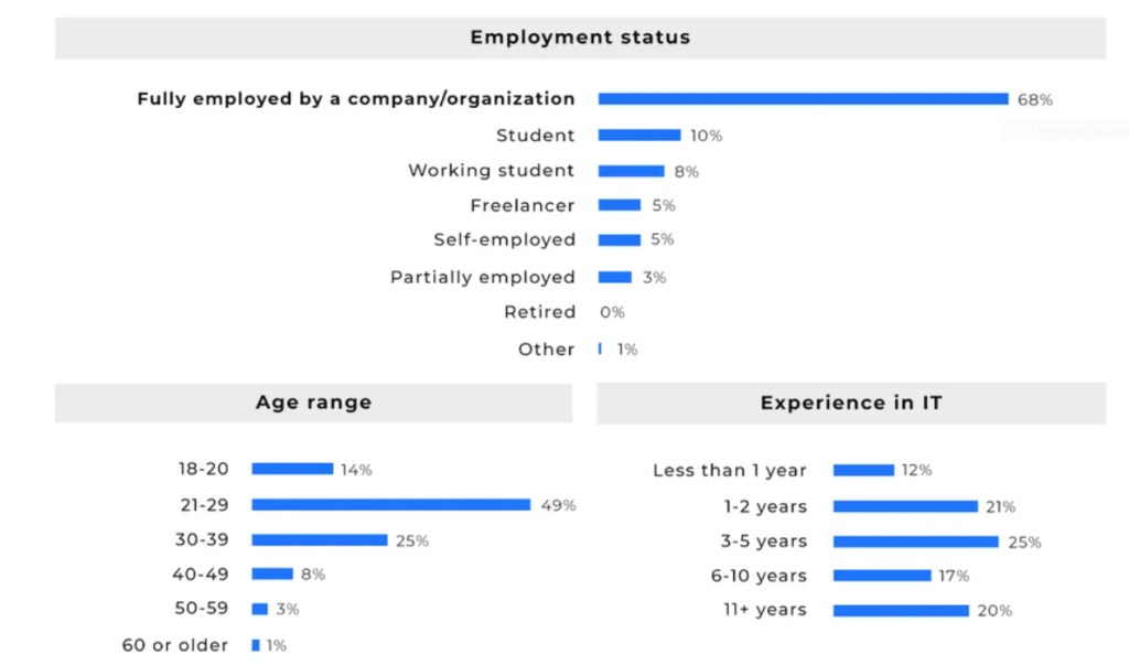 Чтобы получить более полное представление о сообществе Python, мы проанализировали данные опроса JetBrains за 2020 год и визуализировали их в виде инфографики.