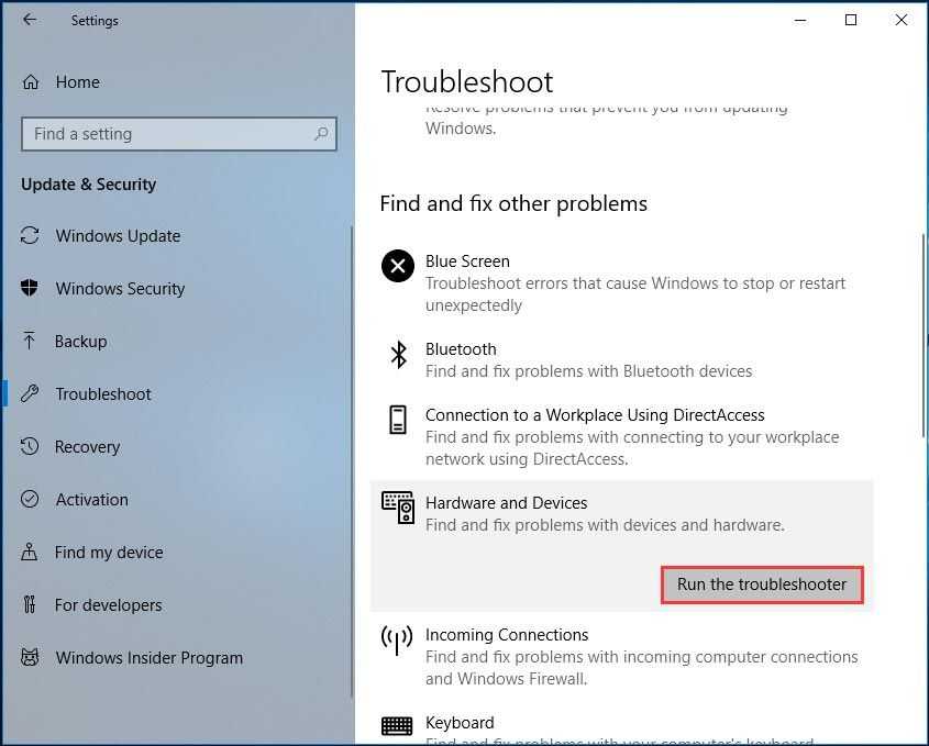 Шаг 3: Найдите Оборудование и устройства , затем щелкните Запустите средство устранения неполадок . Просто следуйте инструкциям на экране, чтобы завершить исправление.